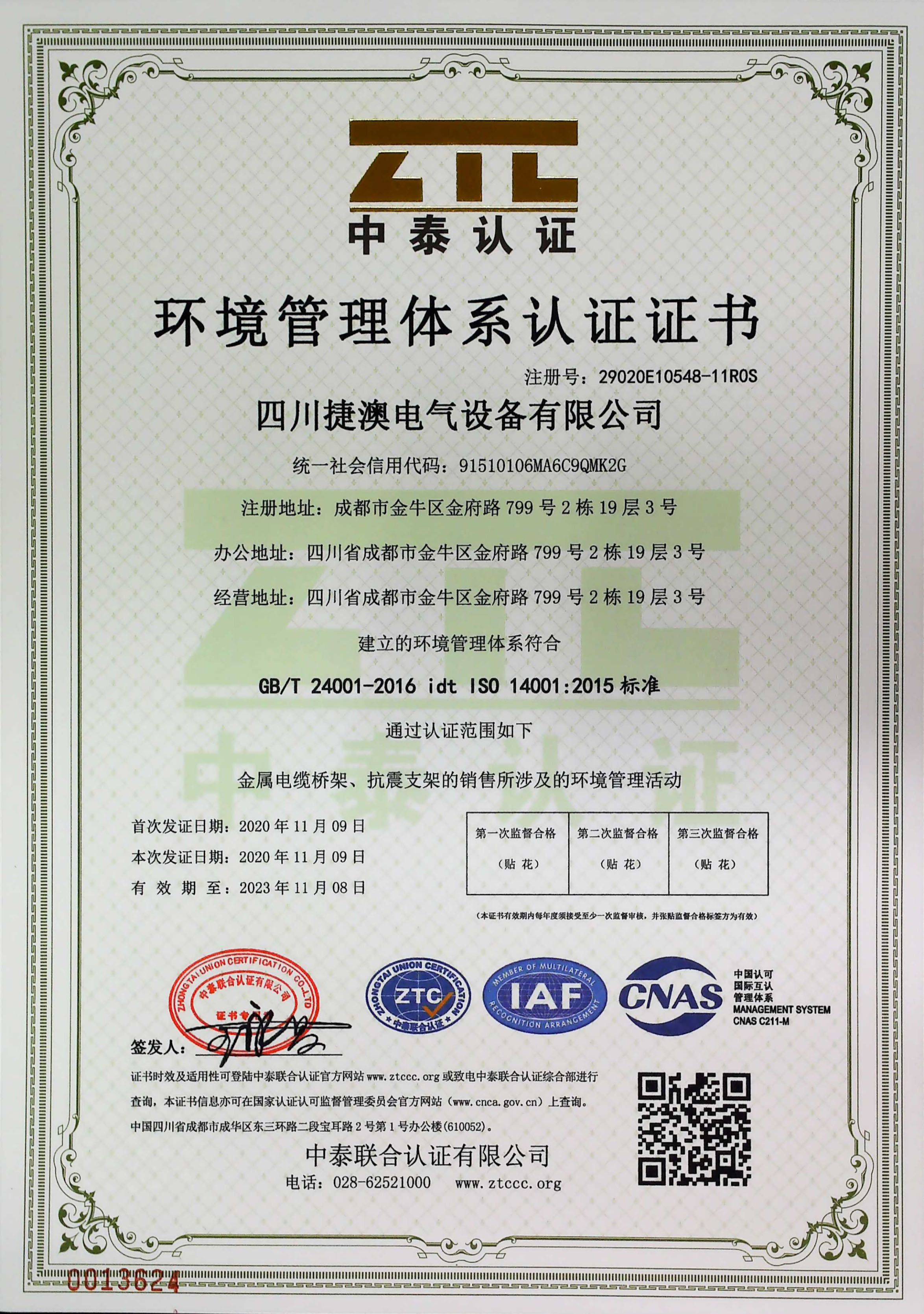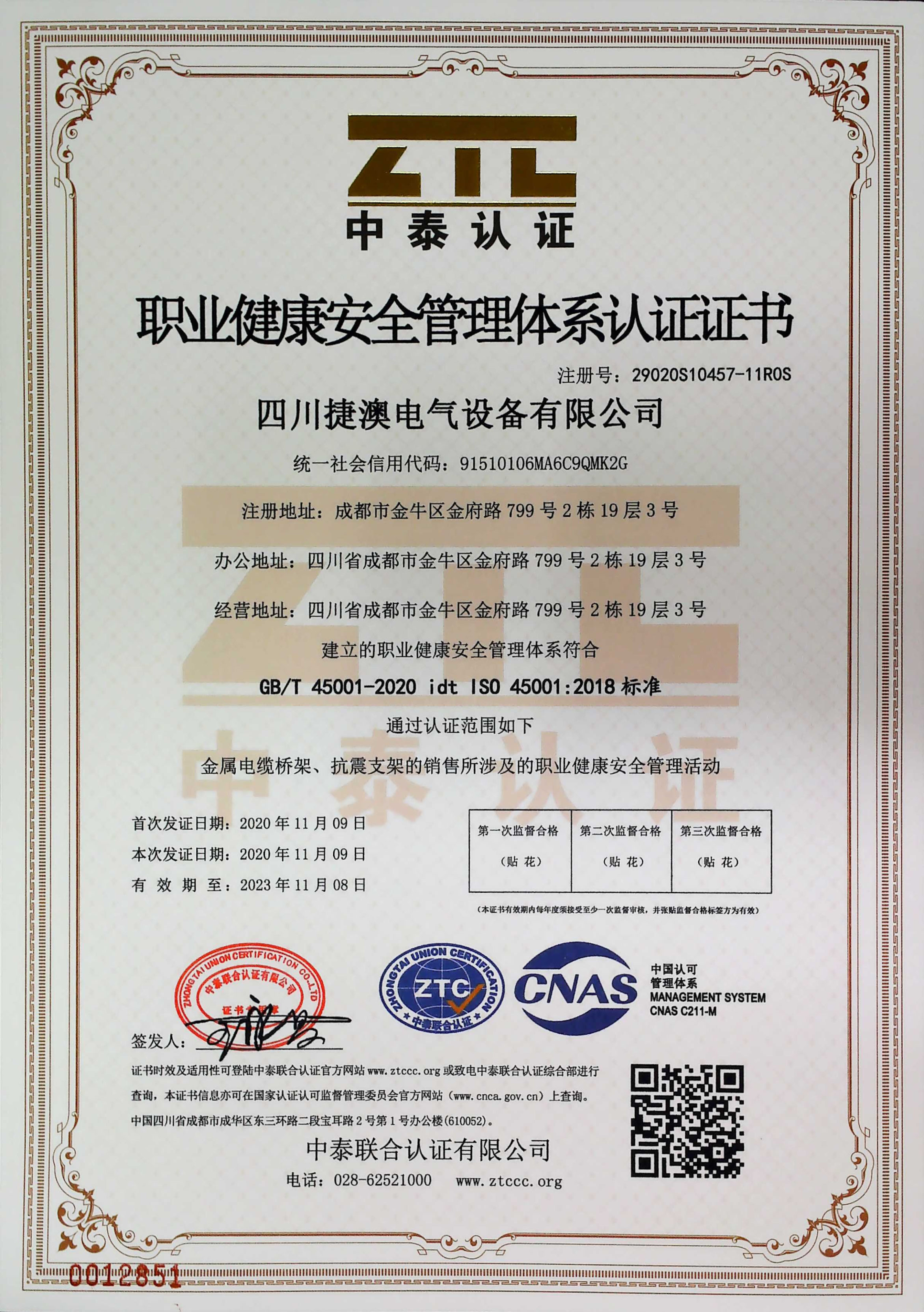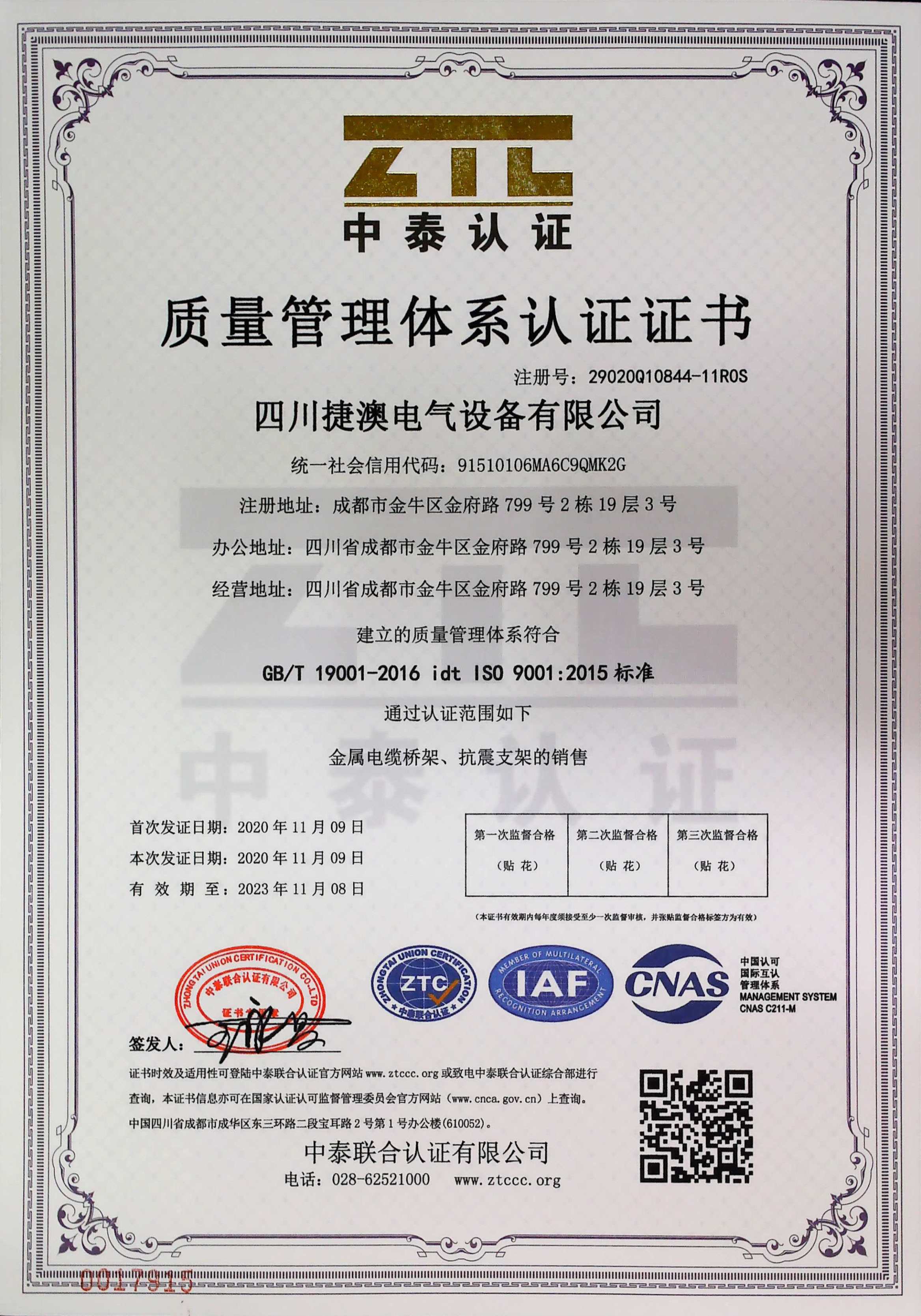 四川捷澳电气设备有限公司坚持以客户为中心,视商品质量为企业生命线,面对后疫情经济形势,不惧挑战,逆难而上,秉承“诚信 服务 合作 共赢”的经营理念,全方位提高公司标准化、规范化、精细化管理水平,保证产品质量,加强环境保护,切实保障员工职业健康安全,致力于成为客户值得信赖的一站式电缆桥架及抗震支架采购服务商。